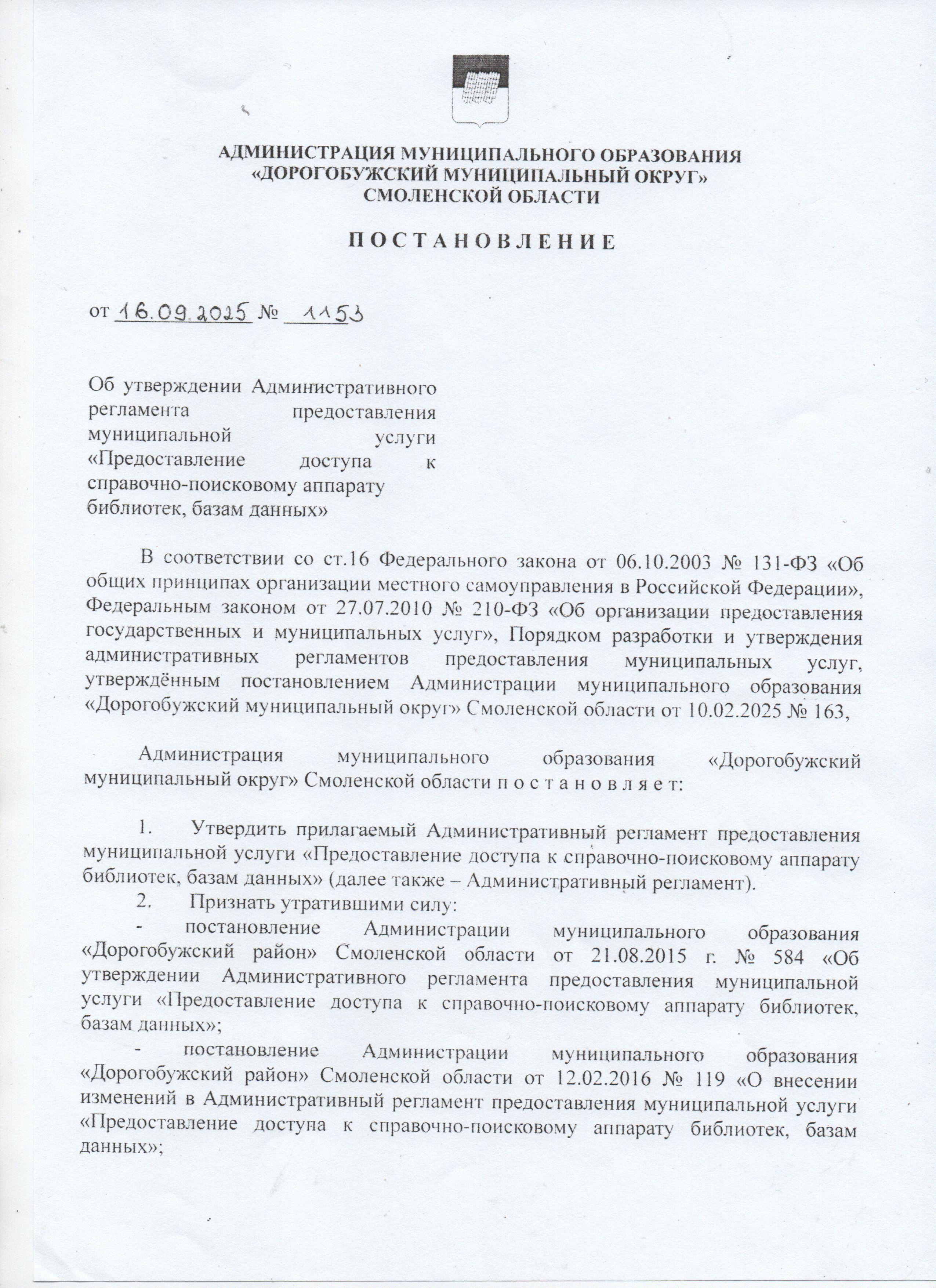 Административный регламент предоставления муниципальной услуги «Предоставление доступа к справочно-поисковому аппарату библиотек, базам данных", утвержденный постановлением от 16.09.2025 №1153